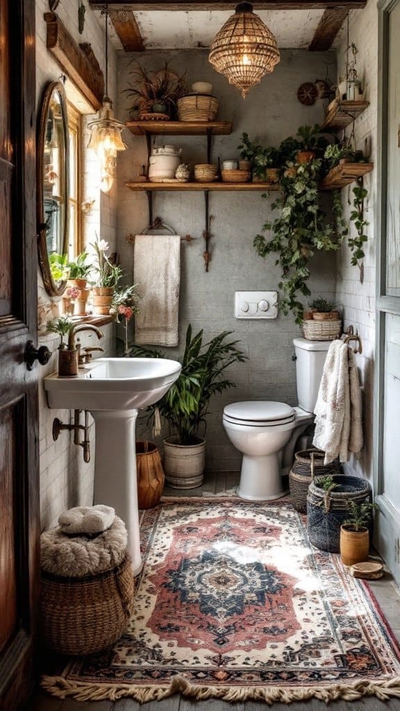Rugs can completely transform the vibe of a small bathroom. Choosing a boho or vintage rug adds warmth and character without overwhelming the space.