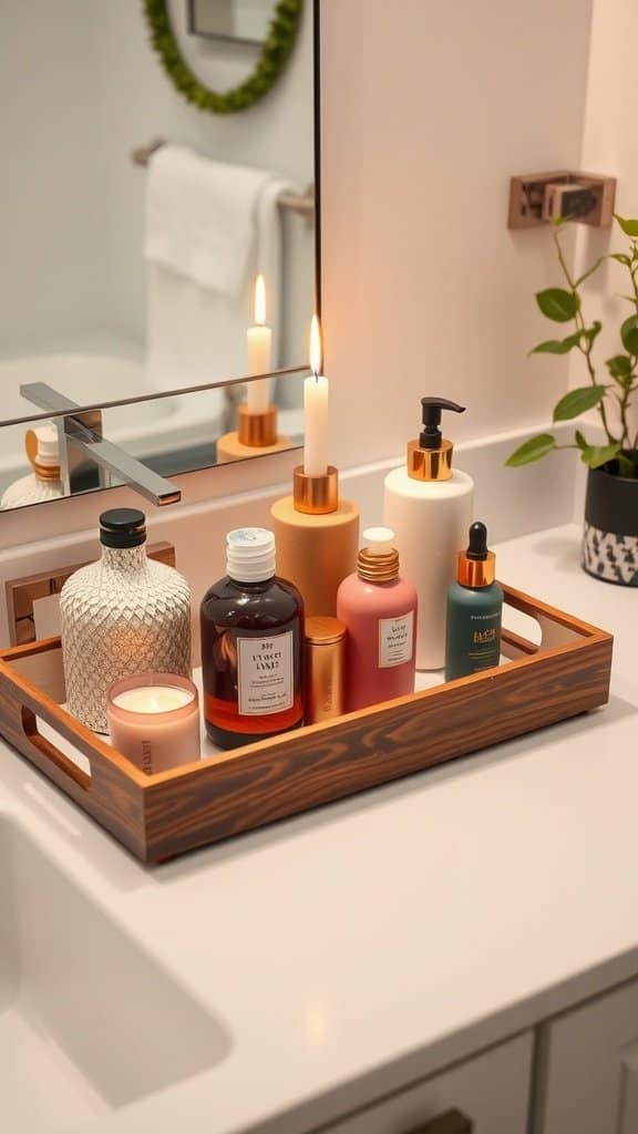 Decorative trays are a smart addition to any small bathroom. They help keep your essentials organized while adding a touch of style. Using a tray, you can corral items like lotions, candles, and fragrances, making your space feel tidy and curated.