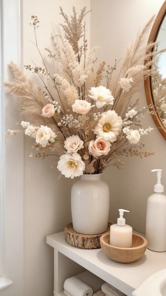 Dried floral arrangements are a charming way to bring a touch of nature into your small bathroom. They add color and texture without overwhelming the space, making them ideal for compact areas.
