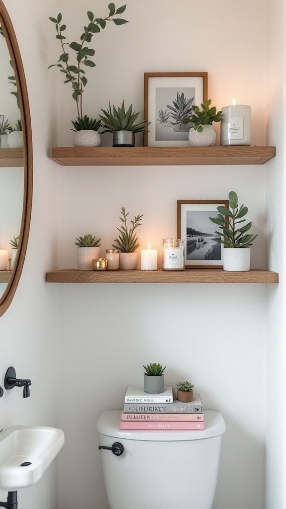 Consider adding a mix of plants, picture frames, and candles. These elements not only add color and texture but also create a warm atmosphere. Plants like succulents require little maintenance, making them perfect for a bathroom setting.