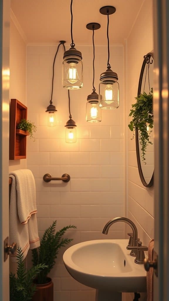 Adding hanging mason jar lights or lanterns to your small bathroom can dramatically change the atmosphere. These fixtures bring a cozy, rustic vibe that feels inviting and warm. They are not just about illumination; they also serve as striking decor pieces that can easily be swapped out or updated.