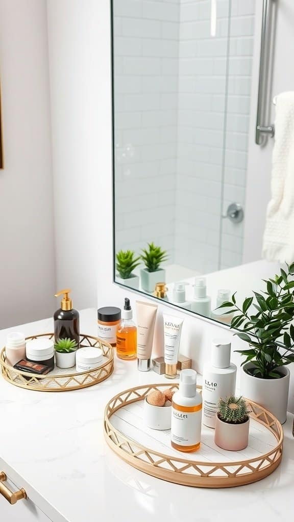 Start by choosing a couple of trays in different sizes. A larger tray can hold bottles and jars, while a smaller one is perfect for smaller items like cotton pads or lip balms. Layering different heights creates visual interest and makes your vanity look more inviting.