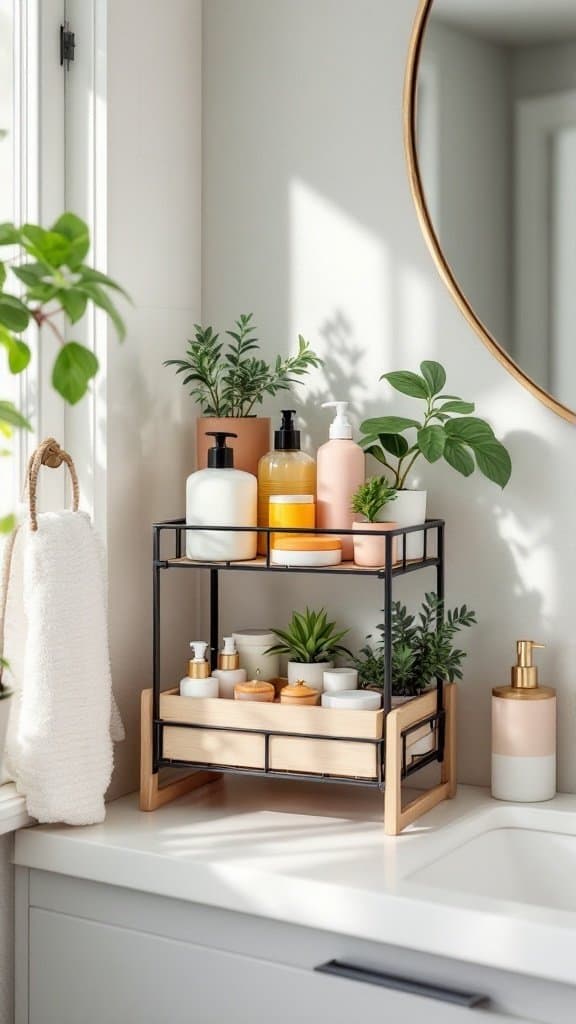 A tiered storage stand is a smart choice for any small bathroom. Its vertical design maximizes space by utilizing every inch of your countertop. You can easily organize your daily essentials, from lotions to toiletries, all in one place.