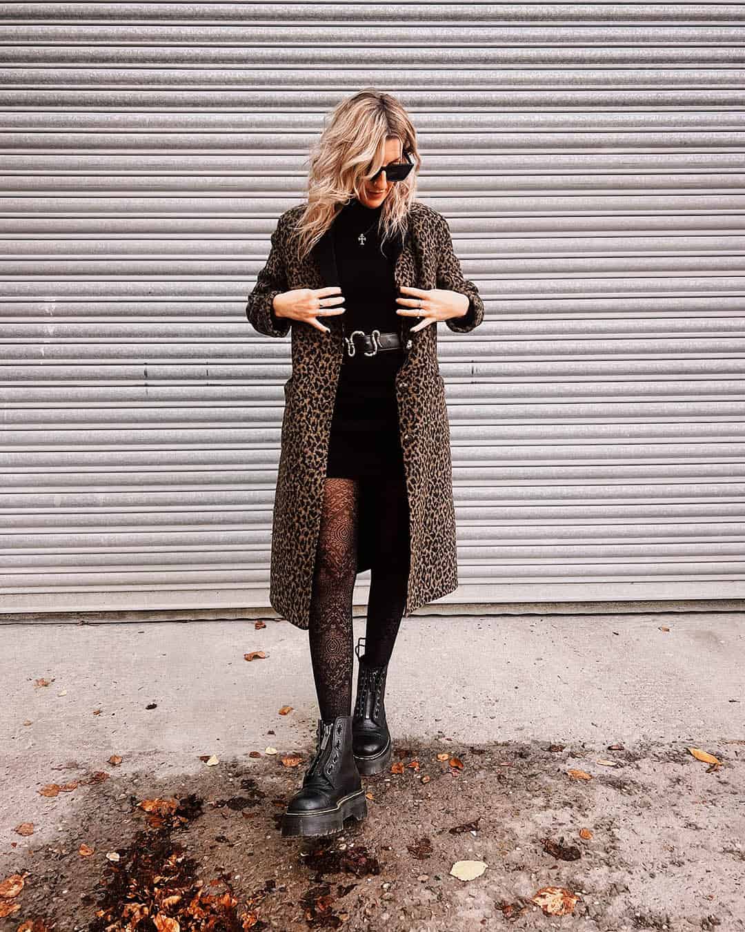 A leopard coat over an all-black outfit is one of the easiest things you can put together in this whole aesthetic. Black turtleneck, black mini, patterned tights, combat boots, leopard coat on top. That’s the whole outfit. It takes like four minutes.