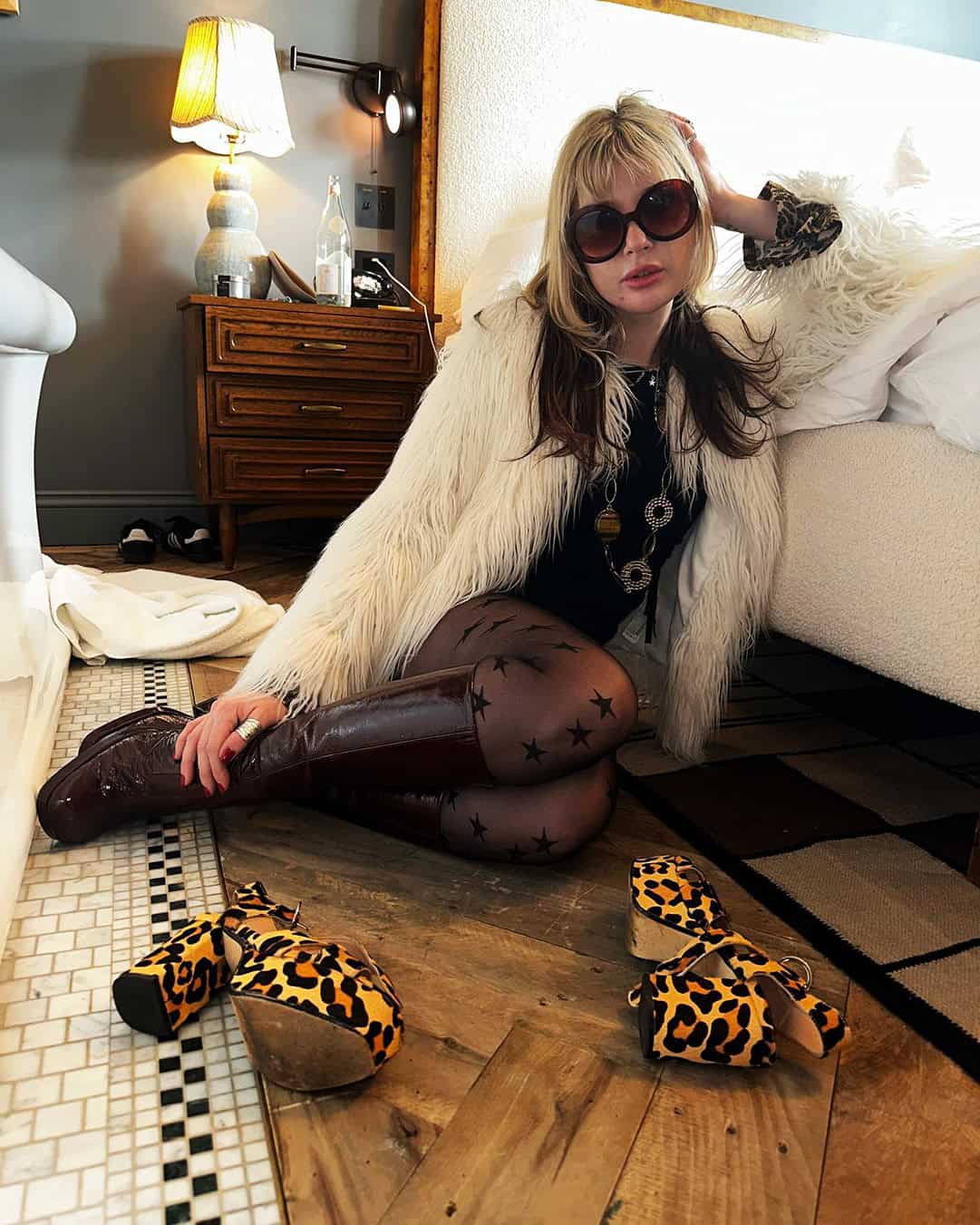 Sitting on a hotel room floor in a fluffy coat and star print tights with your shoes kicked off somewhere behind you. It’s the setting as much as the outfit. The implication that you got here from somewhere and you’re leaving for somewhere else later.