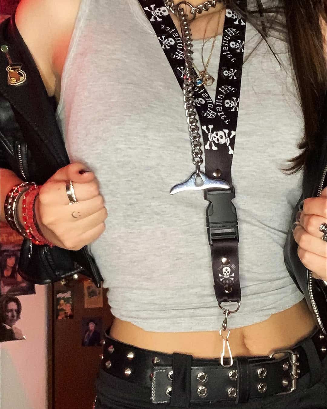 The accessories are doing a lot of heavy lifting in this look. Layered chains, chunky rings, studded belts, chokers, vintage scarves tied in the hair. It’s a lot of pieces but it never looks like too much because none of it matches on purpose.