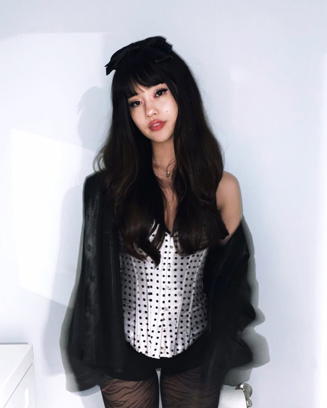 A polka dot corset with a leather jacket half off the shoulder sounds like a lot of pieces but it comes together really easily. Add a black bow somewhere in the hair and the whole thing just clicks.