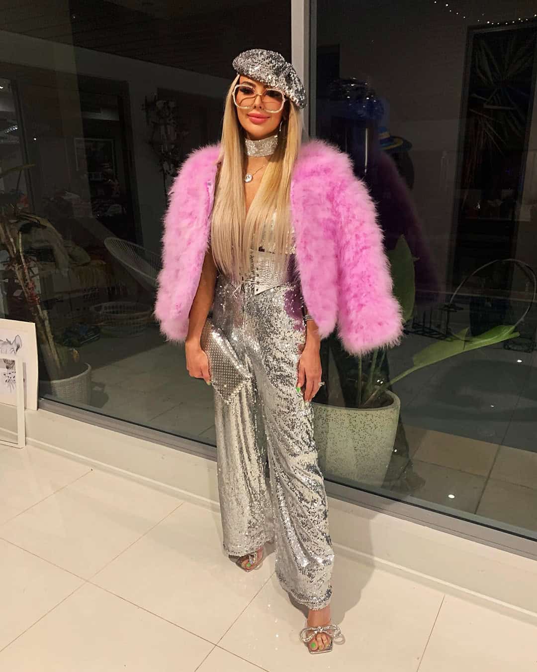 And then sometimes it goes full glam. Silver sequins, a pink feather jacket, a sequin cap. Which is a completely different energy but still fits somehow. That’s the range of this aesthetic, it can go from barely trying to completely over the top and both versions make sense.