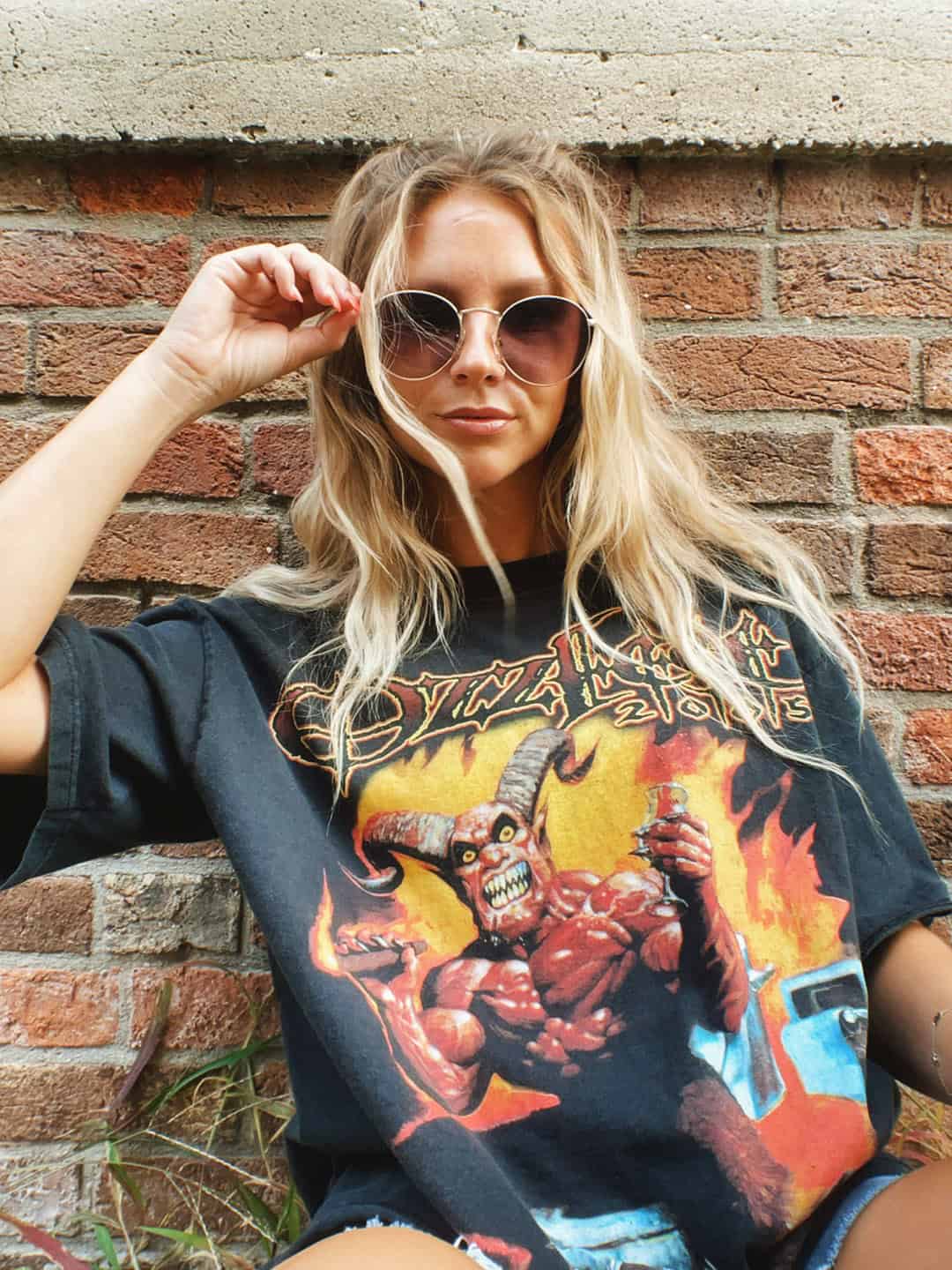 For finding them, hit the thrift stores and Depop. You want something that looks like it’s been washed so many times the graphic is starting to crack a little. If it’s stiff and dark and obviously new it’s going to look like a costume; soft and faded is the goal.