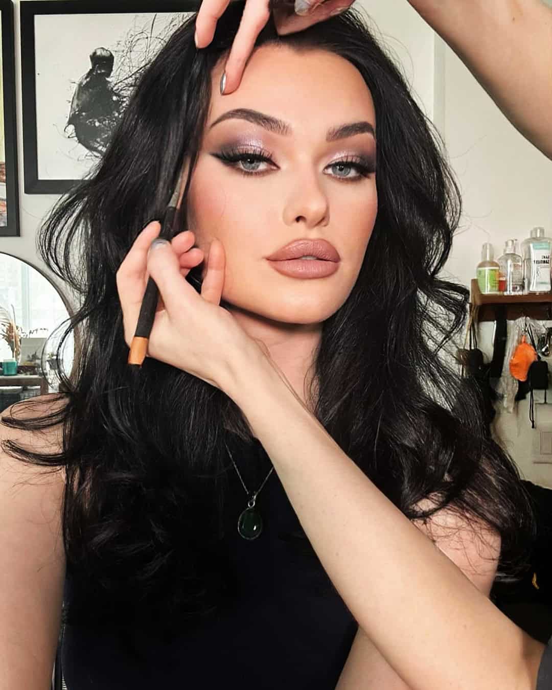 The eyes are doing most of the work. Kohl liner, smudged, not sharp, not precise, just smudged along the lash line like it’s been there for a few hours. A little shimmer on the lid. Mascara that’s maybe one coat too many. The lips are usually pretty quiet, a nude or a gloss, because the eyes are already talking loud enough.