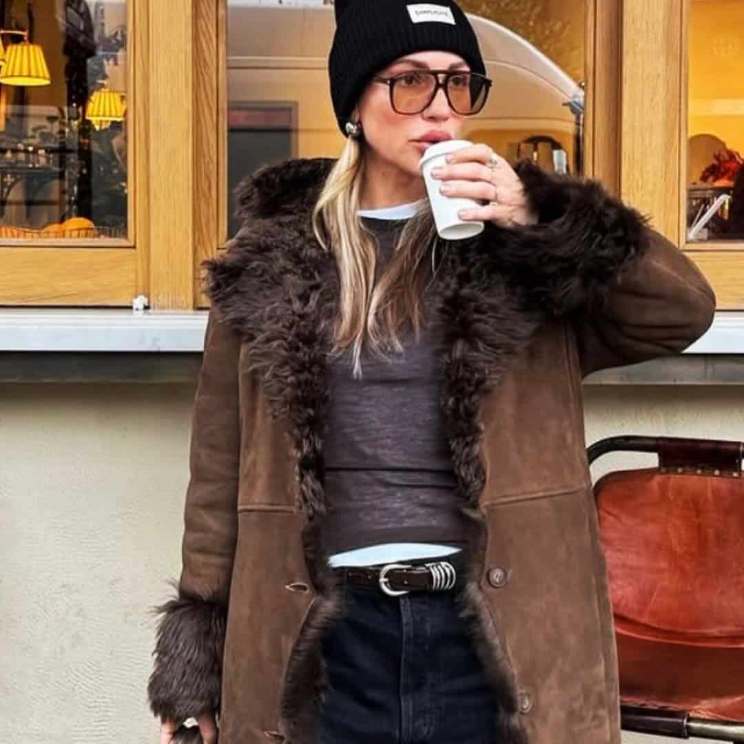 The classic version is long, with a big shearling collar and deep cuffs. That’s the one that shows up in every Almost Famous mood board ever made and for good reason – it’s perfect.