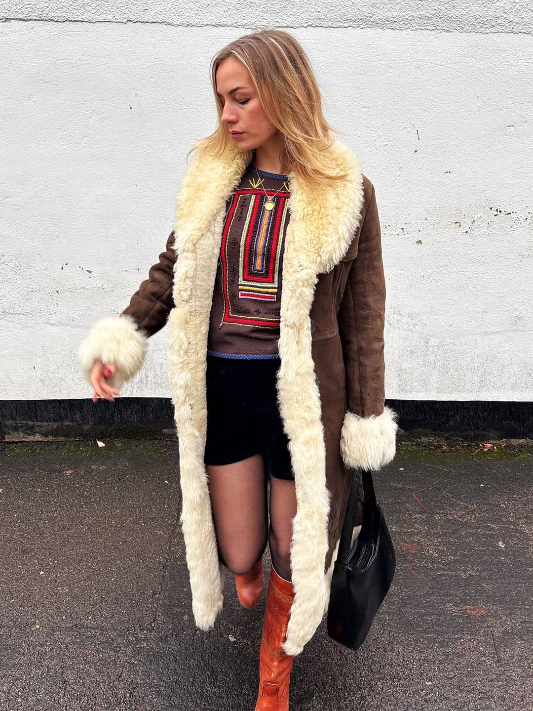 It’s a shearling coat, usually suede or something suede-adjacent on the outside, with big fluffy lapels and cuffs. It looks like it costs a lot. It looks like it’s been places. It makes literally everything you put on underneath it just look better.