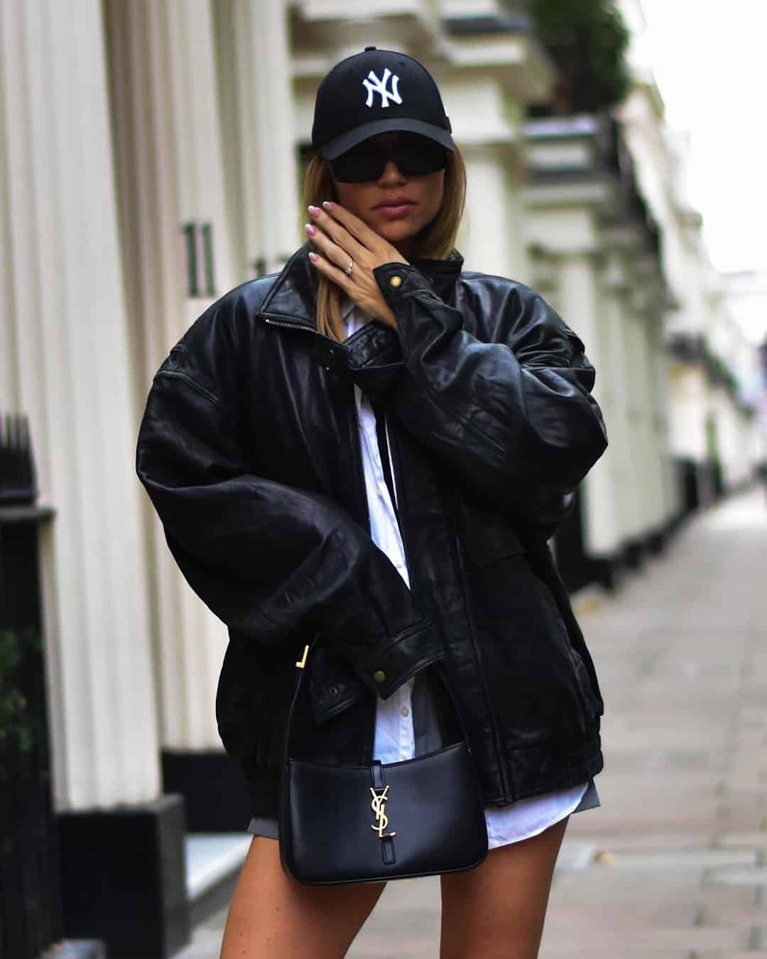 The baseline night out outfit is a sheer black top, a leather jacket, and whatever’s going on below. Outside a dark bar or venue. That’s the uniform and it genuinely requires almost no effort to pull off.